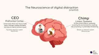 Laure Pauly: Man kann sich das menschliche Gehirn so vorstellen: Der präfrontale Cortex ist der CEO und zuständig für Konzentration, Planung und Selbstkontrolle. Das limbische System ist eher der „innere Schimpanse“: emotional, impulsiv, stets auf der Suche nach Neuem und schnellen Belohnungen. In der digitalen Welt wird der CEO ständig unterbrochen, während der Schimpanse durch Likes und Messages aktiviert wird. Das Ergebnis ist Ablenkung.