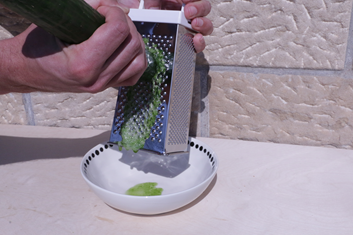 - Zerkleinere die Gurke mit der Reibe über der Schüssel. Achte darauf, dass alles (Fruchtfleisch und Wasser) in die Schüssel gelangt.