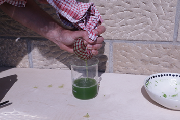 - Presse das Gemisch durch das Tuch/die Strumpfhose in den Messbecher.