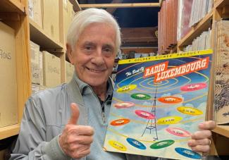 Ehemaliger Radio Luxembourg-DJ und -Programmdirektor Tony Prince in seinem Archiv. April 2023