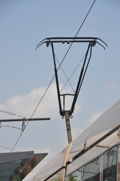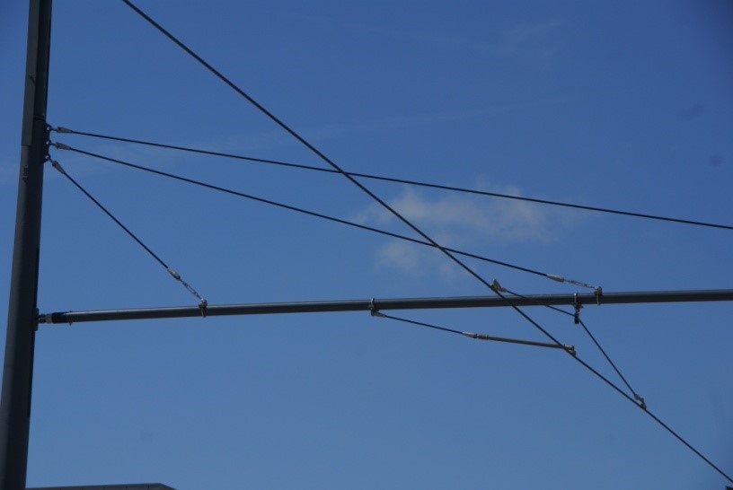 En plus, la LAC n’est pas parallèle aux rails : elle est tendue légèrement en zigzag au-dessus des rails afin que le point de contact de l’archet avec le fil se ballade sur toute la largeur de l’archet lorsque le tram circule. Ainsi la couche de carbone de l’archet s’use uniformément sur toute la largeur.