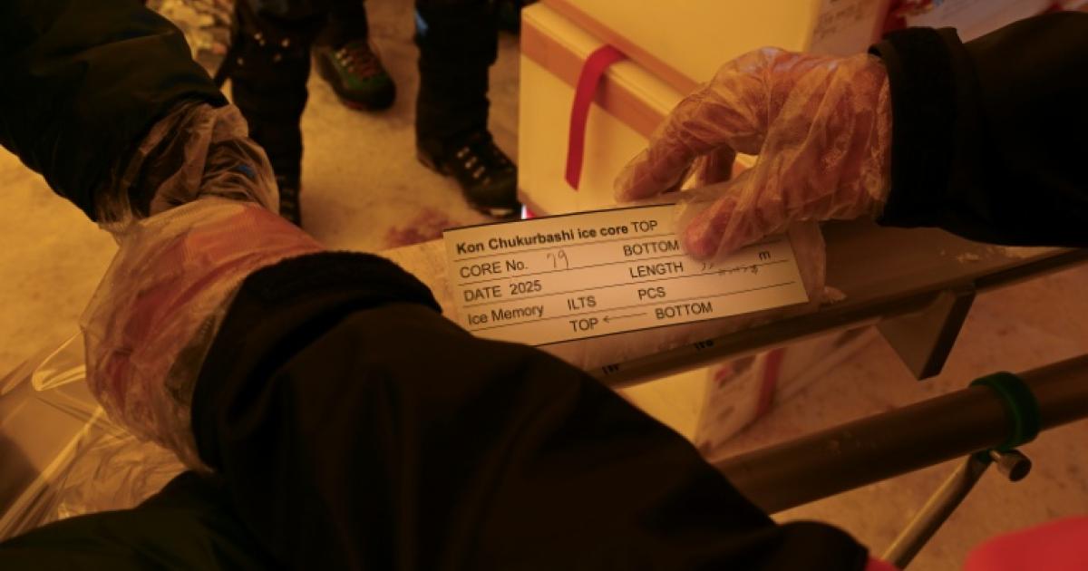 Un membre de l'expédition "Pamir Ice Memory" étiquette une carotte de glace extraite du glacier du Pamir, le 24 septembre 2025 à Kon Tchoukourbachi, dans l'est du Tadjikistan