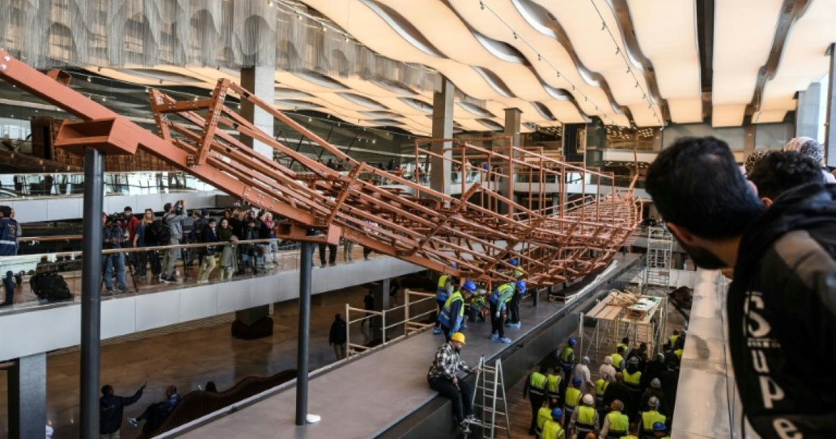 Des employés installent des planches de bois anciennes provenant de la deuxième barque du roi Khéops sur une structure métallique au Grand Musée égyptien de Gizeh, en périphérie du Caire, le 23 décembre 2025