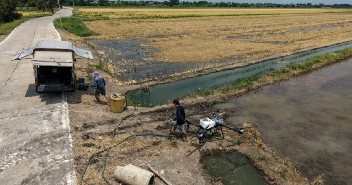 Des opérateurs de drones agricoles s'apprêtant à pulvériser des solutions microbiennes sur les chaumes d'une rizière dans la province de Pathum Thani, en Thaïlande, le 30 mars 2026