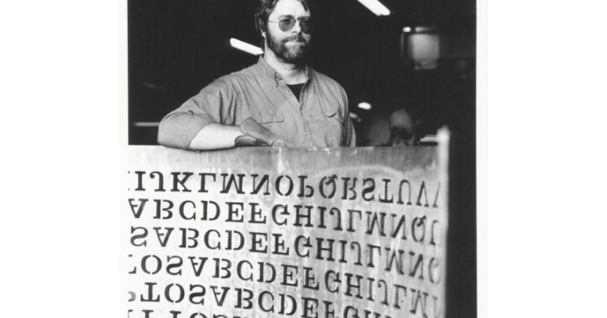 Cette photo de 1990, fournie par Jim Sanborn, montre le sculpteur Jim Sanborn avec un bout de sa sculpture en cuivre "Kryptos", installée au siège de la CIA, en Virginie, aux Etats-Unis