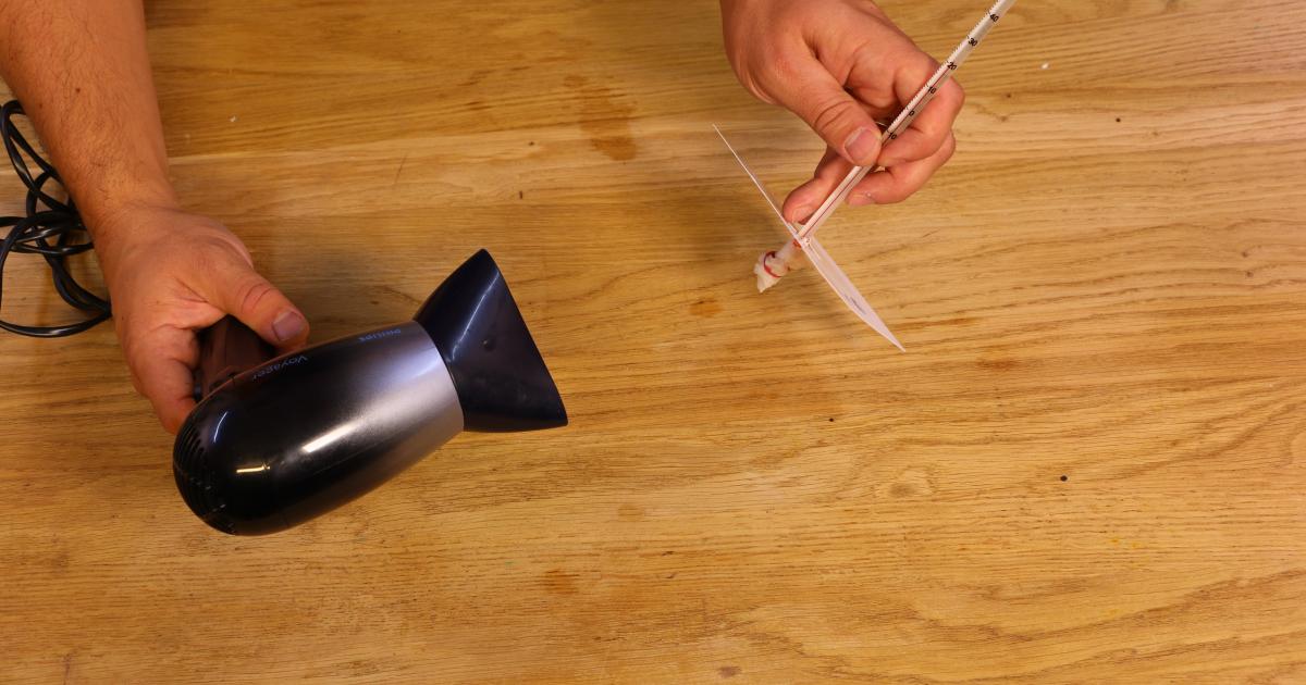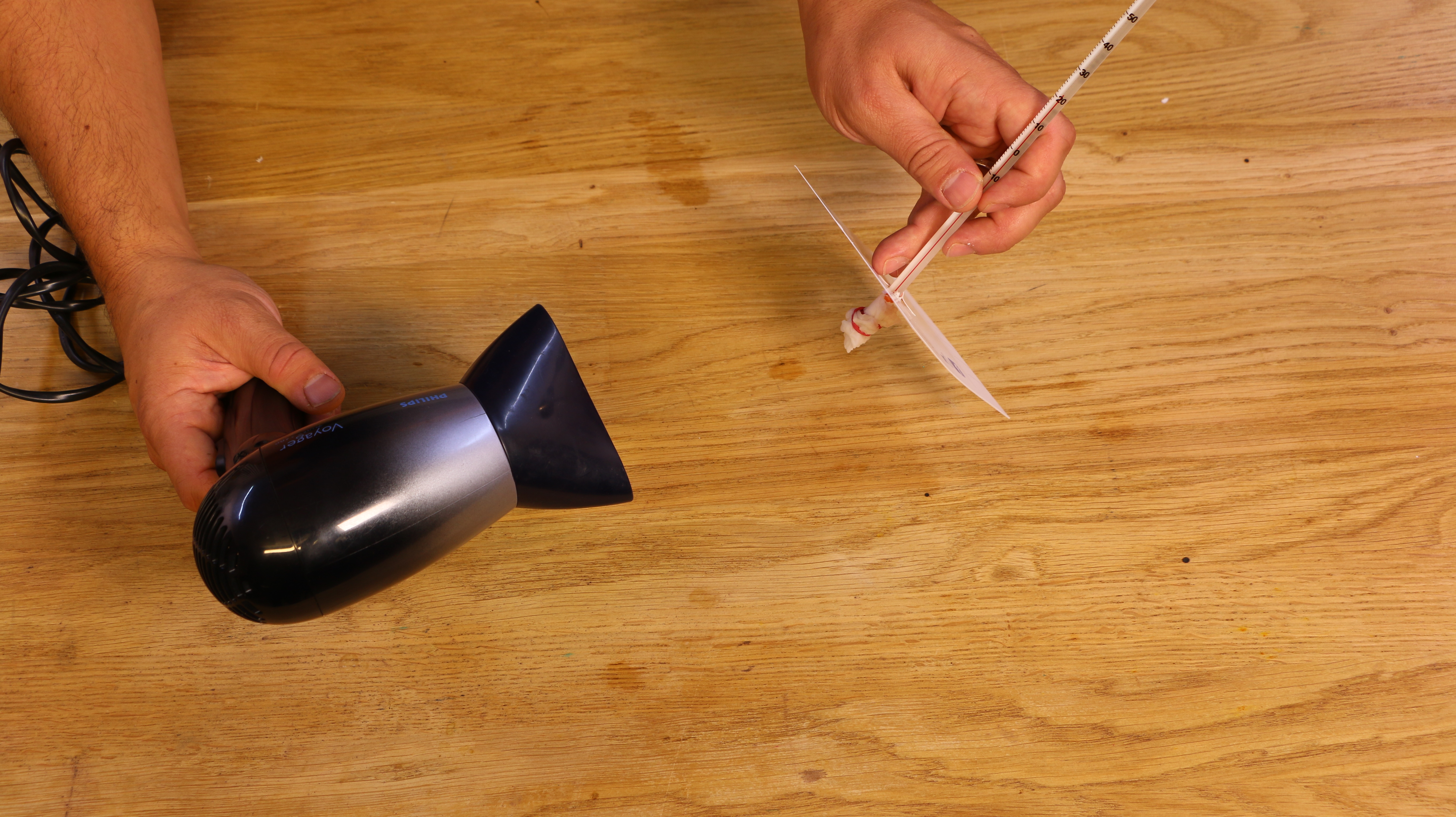 - Schalte den Föhn auf die unterste Stufe und richte ihn auf die umwickelte Spitze des Thermometers. Der Abstand vom Föhn zum Thermometer sollte um die 15cm (ungefähr die Länge eines Bleistiftes) betragen. Pass auf, dass Du den Abstand so gut wie möglich während des Experimentes einhältst.