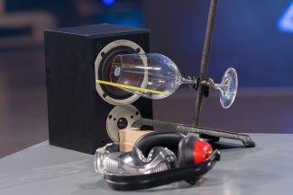 Each candidate was given a wine glass, a loudspeaker, a frequency analyzer (a measuring device that determines pitch), and a straw. The straw placed inside the glass serves to make the vibrations more visible. The more the straw jumps back and forth inside the glass, the closer one is to the correct resonance frequency.