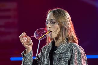 In this challenge, the task was to determine the resonance frequency (natural frequency) of a wine glass - that is, the tone at which the glass vibrates particularly strongly. This can be found by lightly tapping the glass. The candidates then had to generate exactly this frequency using sound in order to make the glass shatter.
