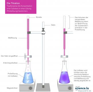 Die Titration ist ein Verfahren, mit dem sich die Konzentration einer chemischen Substanz in einer Lösung bestimmen lässt.