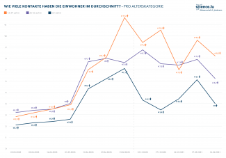 Nach der neuesten Umfrage auf science.lu haben die Einwohner Luxemburgs aktuell ca. 5,7 physische Kontakte pro Tag. Im Vergleich: Vor dem Lockdown betrug dieser Wert ca 17,5 (Daten aus einer ähnlichen Studie von Joël Mossong im Jahr 2008).