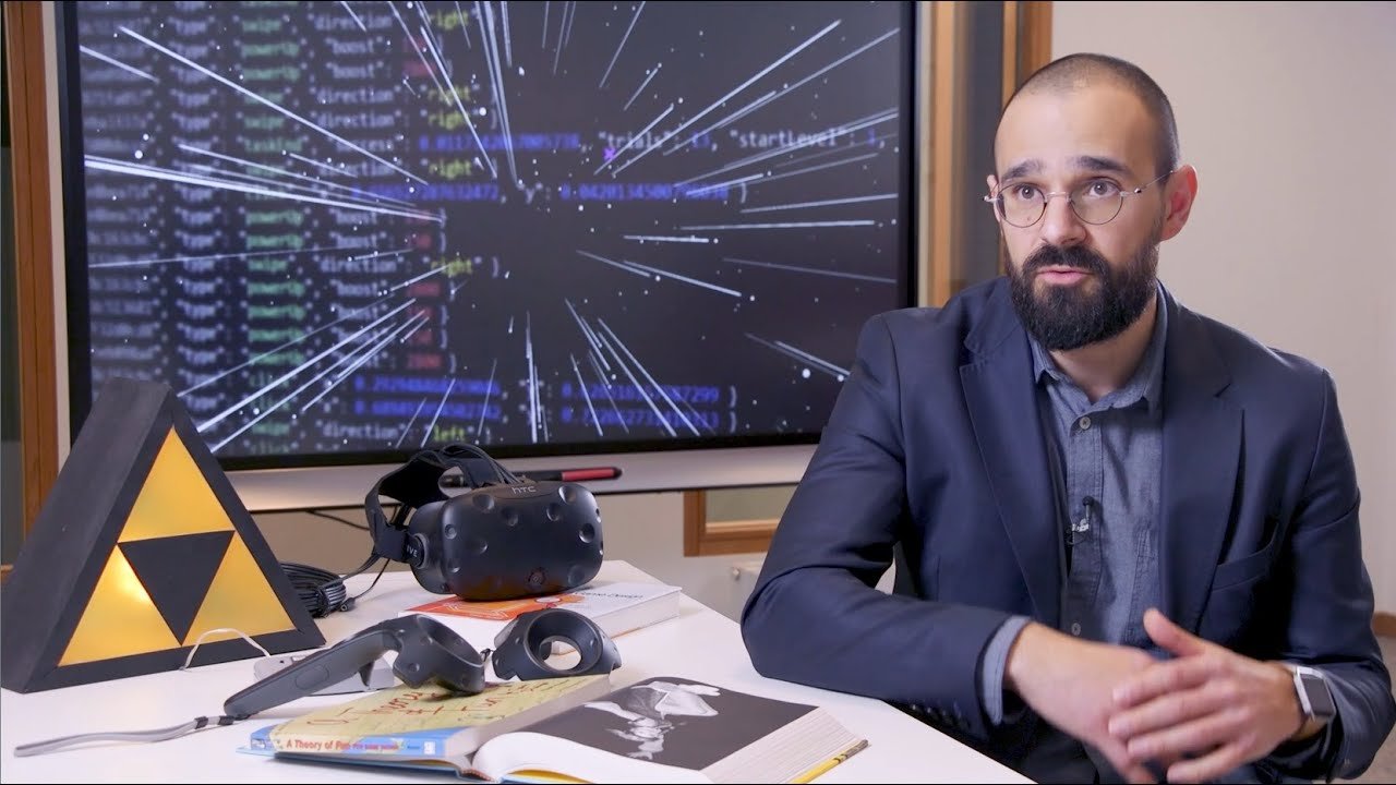 Im Video ist, unter anderem zu sehen, wie Pedro Cardoso-Leite im Labor mit einer 3D-Brille ein von der Forschergruppe entwickeltes Astronautenspiel im virtuellen Weltraum spielt.
