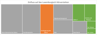 Abbildung: Einflussfaktoren auf das Luxemburgisch-Hörverstehen (in Grün: positive Assoziierungen, in Rot: negative Assoziierungen, in Grau: Parameter außerhalb des Einflusses der Schulpolitik. Quelle: Hornung, C., Kaufmann, L. M., Ottenbacher, M., Weth, C., Wollschläger, R., Ugen, S. & Fischbach, A. (2023). Early childhood education and care in Luxembourg. Attendance and associations with early learning performance. Luxembourg Centre for Educational Testing (LUCET). doi: 10.48746/epstanalpha2023pr)