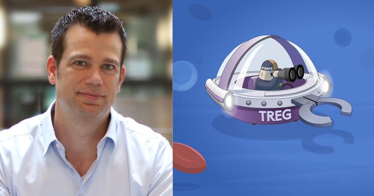 Links: Dirk Brenner, Luxembourg Institute of Health; rechts: Cartoon einer regulatorischen T-Zelle, dargestellt als Sicherheitswächter des Immunsystems
