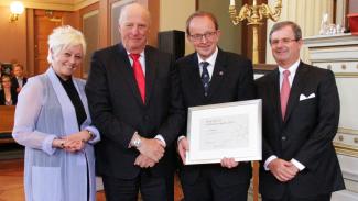 Preisverleihung des King Olav V Cancer Research Prize. V.l.n.r.: Anne Lise Ryel (Generalsekretärin der Norwegian Cancer Society), Seine Hoheit König Harald V, Prof. Rolf Bjerkvig und Carl Otto LØvenskiold (Vizepräsident der Norwegian Cancer Society