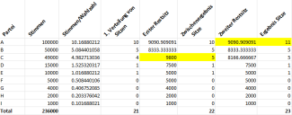 Wichtig: die Wahlzahl wird immer aufgerundet (die Zahl hat also keine Stellen mehr hinter dem Komma). Also im Falle des Bezirks Süden: Gesamtzahl aller Stimmen geteilt durch 23+1=24, dann aufgerundet. Im Falle des Nordens: Gesamtzahl der Stimmen geteilt durch 9+1=10, dann aufgerundet.