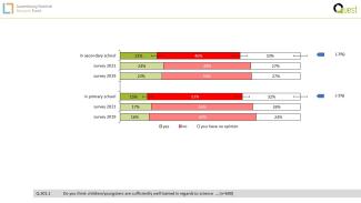 - Das Vertrauen in Wissenschaft und Forschung ist bei der luxemburgischen Bevölkerung nochmal gestiegen, von 67% im Jahr 2019, 70% im Jahr 2021 auf 75% im Jahr 2023. Dies ist ein hoher wert, im Vergleich zu gleichen Studien im Ausland.