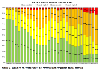 Abbildung: Verlauf des Gesundheitszustandes der Bäume in Luxemburg, 1984 – 2023, alle Arten. Quelle: ANF (2023)