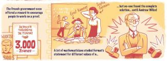 "We are Daniel Mamo, Emiliano Torti, Filippo Mazzoli, and Sebastiano Tronto. We are PhD students in Mathematics at the University of Luxembourg. Three of us work in number theory, and for our comic we have chosen to describe our “everyday life” as mathematics students by talking about a famous result in this area: Fermat’s last theorem. Our main intention is to transmit our fascination for challenging mathematical questions like this, which is one of the main reasons that led us to continue our academic career. The characters are fictional, but the senior member is inspired by one of our Professors, Antonella Perucca from the Mathematics Research Unit."