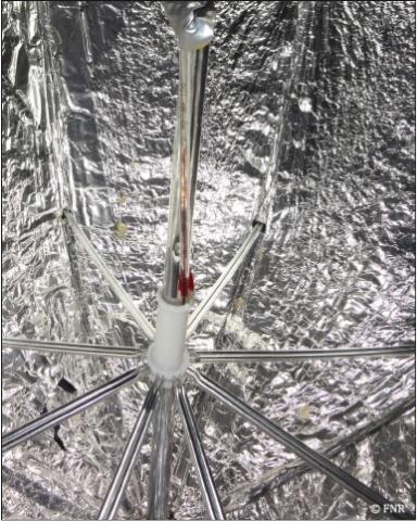 Den Regenschirm spannt man auf und überklebt die Verstrebungen von innen mit doppelseitigem Klebeband. Dann schneidet man die Alufolie so zurecht, dass die Stücke in die Unterteilungen des Regenschirms hinein passen. Die erste Unterteilung bestreicht man mit Flüssigkleber und drückt anschließend das erste Stück Alufolie (oder selbstklebende Spiegelfolie) vorsichtig fest. Gleichermaßen mit dem Rest des Schirms verfahren. Eventuell unbedeckte Teile des Regenschirms noch mit Alufolie überkleben, so dass das ganze Innere des Schirms komplett eingekleidet ist.