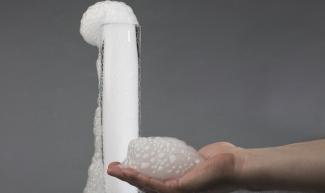 In ein mit Wasser und Spülmittel gefülltes Becherglas gibst du mit einem dicken Handschuh Trockeneisstücke hinzu. Die Flüssigkeit fängt an zu brodeln – langsam bildet sich ein Turm aus Seifenblasen der sich stetig über den Becherrand hinweg ausbreitet.