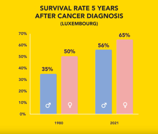 In Luxemburg waren in den 80er-Jahren 35 % der Männer und 50 % der Frauen wenigstens fünf Jahre nach ihrer Krebsdiagnose noch am Leben. 2021 waren es bereits 56 % der Männer und 65 % der Frauen. Und es werden weiterhin Fortschritte gemacht.