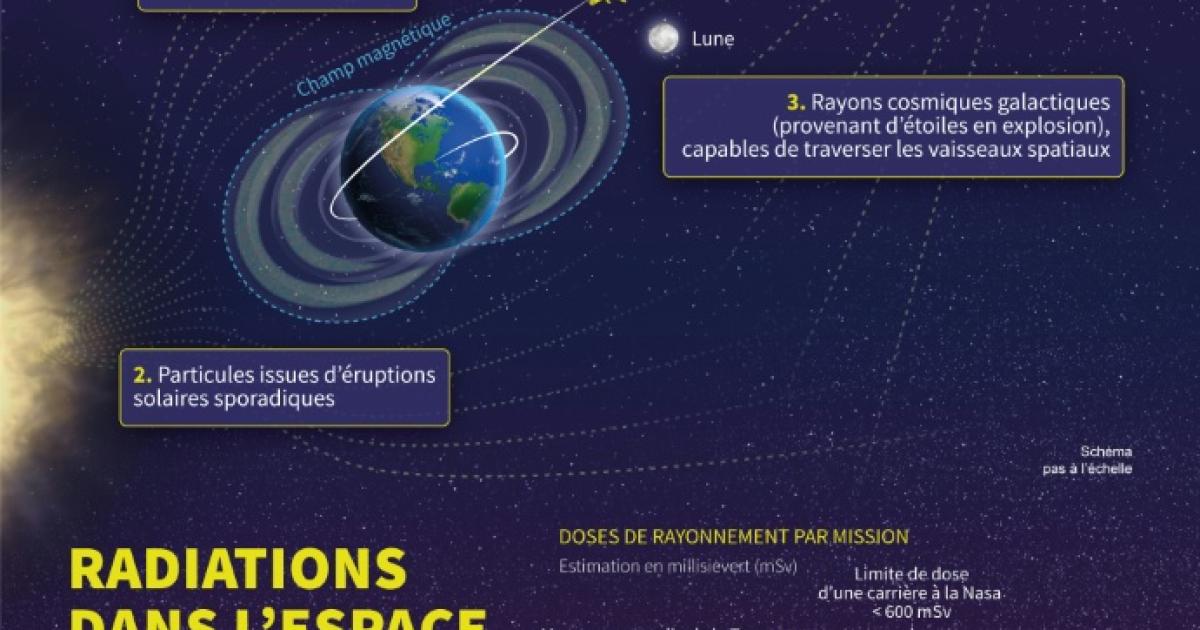 Infographie montrant les trois principales formes de rayonnement spatial qui présentent de sérieux risques pour la santé des astronautes en mission vers la Lune et Mars