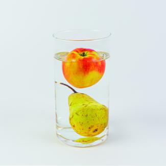 Ob verschiedene Früchte im Leitungswasser schwimmen oder sinken, hängt von ihrer Dichte ab. Die Birne hat eine höhere Dichte als der Apfel. Das bedeutet: Ein gleich groβes Stück von beiden Fruchtsorten (z. B. ein Würfel mit 2 cm Kantenlänge) hat bei der Birne mehr Masse als bei dem Apfel: Das Birnenstück ist bei gleichem Volumen schwerer als das Apfelstück. Ob verschiedene Früchte schwimmen oder sinken, hängt allerdings auch von der Dichte der Flüssigkeit ab, in die sie gelegt werden. Früchte wie der Apfel, die eine geringere Dichte als Wasser haben, schwimmen. Früchte wie die Birne, die eine höhere Dichte als Wasser haben, sinken.
