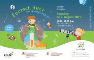 Découvrir, rechercher et expérimenter - telle est la devise de la 9ème édition du « Naturparkfest » le 7 août 2022 de 11:00 à 18:00 au Parc Hosingen. 25 ateliers ouverts pendant toute la durée de l’événement incitent surtout les enfants et les familles à se familiariser avec les caractéristiques d'un Parc naturel et de ses différents champs d'activité. Un point culminant seront les spectacles scientifiques de Joseph Rodesch et de Michael Bradke.