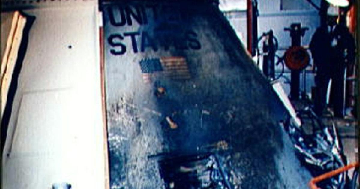 Le module de commande du vaisseau spatial Apollo 1, le 28 janvier 1967 au Centre spatial Kennedy, après un incendie accidentel, le 27 janvier 1967, qui a coûté la vie aux trois membres d'équipage lors d'un entraînement au sol