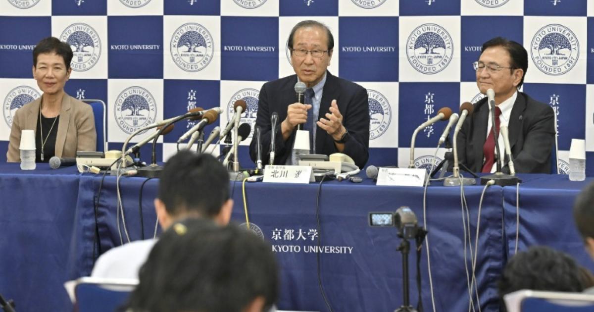 Susumu Kitagawa (c), co-lauréat du prix Nobel de chimie 2025, lors d'une conférence de presse à Kyoto, le 8 octobre 2025 au Japon