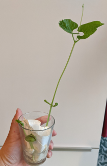 Pour d'autres variétés de haricots comme le haricot écarlate ou d'autres légumineuses comme le pois, le processus de germination est légèrement différent en ce qui concerne les cotylédons. Les cotylédons des haricots écarlates et des pois restent blancs et dans le sol. La tige germinative se plie d'abord vers le haut en formant un arc de cercle. Une extrémité de la tige germinative continue à être reliée aux cotylédons dans le sol, l'autre extrémité s'étire ensuite vers le haut. Les feuilles poussent à l'extrémité. Ce type de germination est appelé germination hypogée (hypo, du grec : sous ; gae, du grec : terre). Dans le cas de la germination épigée, comme chez le haricot nain, les cotylédons poussent hors de la terre et deviennent verts (épi, du grec : au-dessus/sur). Les élèves ont peut-être déjà vu que les tournesols poussent également de cette manière. Parfois, les cotylédons sont même encore recouverts d'une enveloppe de graines brisée. Les cotylédons deviennent ensuite jaunes et meurent.