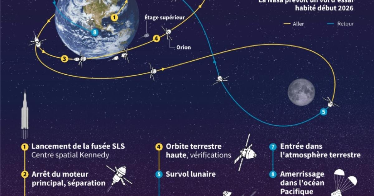 Infographie montrant les principales étapes de la mission Artemis 2 de la Nasa, visant à emmener un équipage de quatre personnes dans le vaisseau spatial Orion autour de la Lune, avec un lancement prévu début 2026