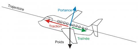 Exprimé de façon simplifiée, un avion est soumis à quatre forces: Son poids le tire évidemment vers le bas, la portance le pousse vers le haut et l'empêche de tomber par terre. La traction l'entraîne vers l'avant et la traînée (résistance de l'air) freine son mouvement. En vol normal ces quatre forces s'équilibrent mutuellement et l'avion se déplace comme si aucune force ne s'exerçait sur lui. Il n'est donc pas accéléré, ni freiné, ni dévié (1er principe de Newton). Il vole en ligne droite et à vitesse constante. Ceci se passe pour la plupart du temps à altitude constante. C'est le cas du vol horizontal, pour lequel les forces s'exerçant sur l'avion sont représentées sur la figure 1. Mais un vol en ligne droite peut également avoir lieu en montant ou en descendant. Par exemple au décollage ou à l'atterissage.