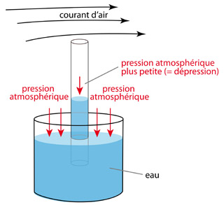 L’air exerce une pression sur toute surface d’un objet qu’il entoure : la pression atmosphérique. En soufflant le long de l’une des surfaces, donc en chassant l’air en contact avec cette surface, on crée une diminution de la pression de l’air perpendiculairement au courant d’air. On peut également observer cet effet en réalisant l’expérience suivante avec un tube, un bol d’eau et un sèche-cheveux :
