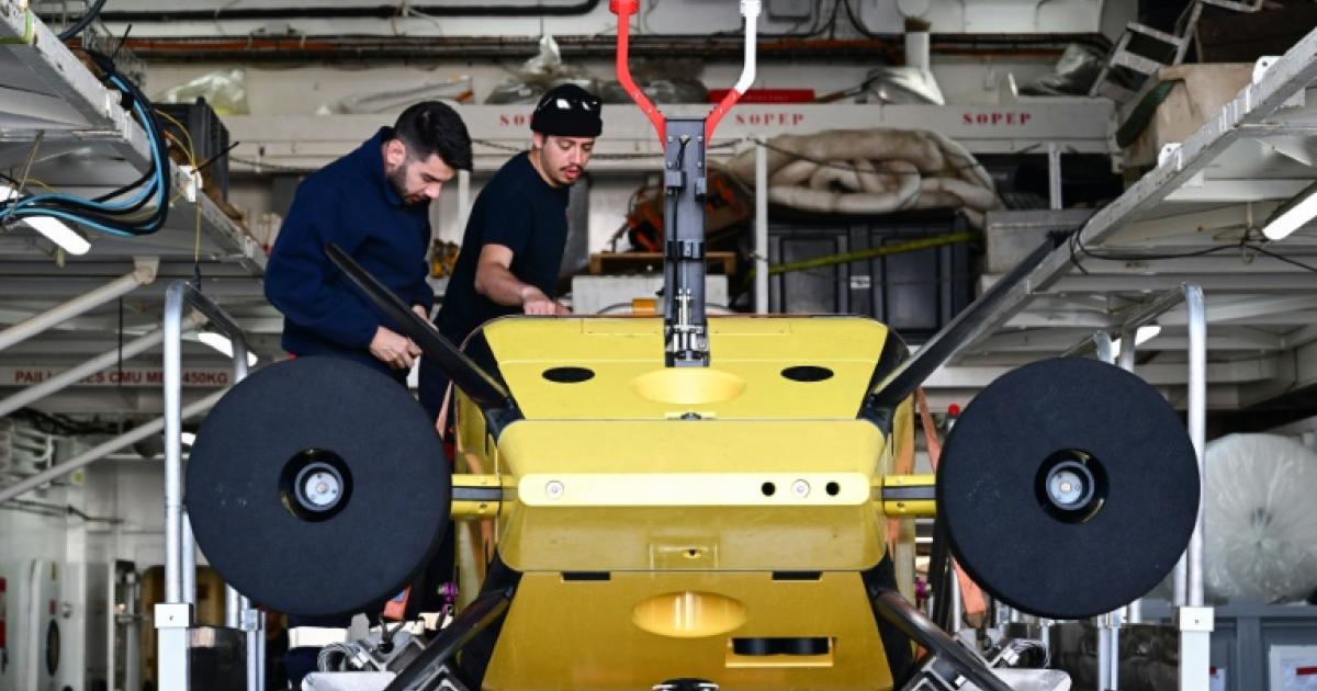 Des techniciens préparent le robot sous-marin Ulyx à bord du navire scientifique L'Atalante, amarré au port de Brest, le 15 juin 2025